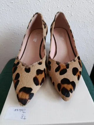 Zapatos de tacón medio con estampado de leopardo. Un solo uso Talla 38 Marca Strover Made in Spain - Diseño de punta fina. - Acabado en pelo. - Marca visible en la plantilla.
