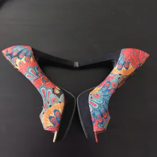 Elegantes zapatos de tacón con un diseño vibrante y llamativo. - Tacón de 12 cm de altura. - Estampado de inspiración paisley en tonos rojos, azules y amarillos. - Plataforma delantera para mayor comodidad. - Punta abierta (peep-toe).