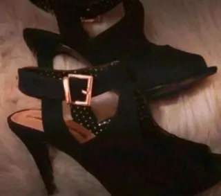 Elegantes zapatos de tacón con un diseño abierto en la punta y detalle de hebilla. - Acabado en ante. - Correa ajustable al tobillo con cierre de hebilla dorada. - Interior con estampado de lunares blancos.