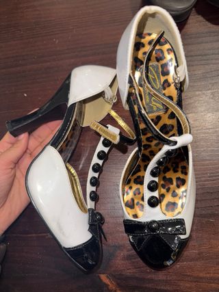 Elegantes zapatos de tacón de la marca Pin Up Couture. - Diseño bicolor en blanco y negro. - Detalle de lazo y botones. - Forro interior con estampado de leopardo.