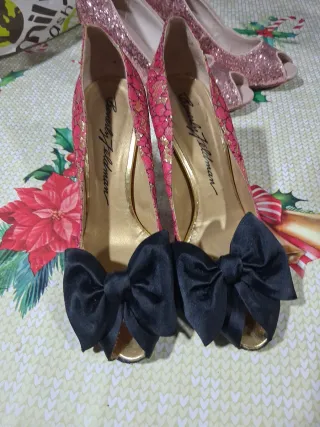 Elegantes zapatos de salón con un diseño llamativo. - Detalle de moño negro en la punta. - Estampado floral en tonos rosa y dorado. - Marca: Beverly Feldman.