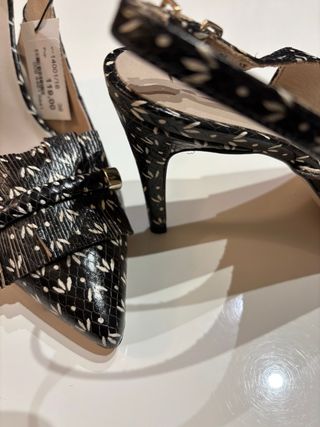 Elegantes zapatos de tacón con un estampado llamativo. Precio original 119 € - Diseño de punta fina. - Adorno de volantes en la parte delantera. - Hebilla dorada. - Tacón de aguja.