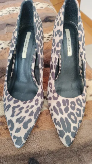 Zapato Zara destalonado estampado animal Talla 38 Muy poco uso, el tacón está un poco rozado y habría q cambiar las tapas Se entrega con bolsa para guardar calzado