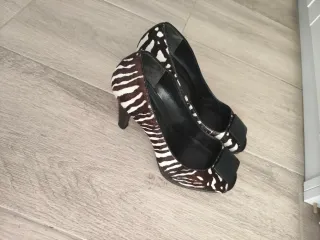 Zapatos de tacón de cuña, estilo pelo de estampado animal, en talla 40, de Zara. Usados un para asistir a un par de bodas únicamente, por lo que están en muy buenas condiciones, salvo por la suciedad de la suela y alguna manchita pequeñita y ligeras marcas de los dedos en las plantillas. A la venta por 7'50€. Hago lotes con cualquiera de los artículos de mi armario y negocio precios. Hago ventas en persona y envíos. Gracias!