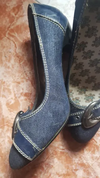 Elegantes zapatos de tacón en tono azul, perfectos para ocasiones especiales. - Diseño con hebilla plateada. - Detalle de pedrería en la hebilla. - Costuras decorativas. - Suela con estampado. ***** DE ESTAR GUARDADOS... Se han agrieta la parte de atras, como se ve en las fotos.
