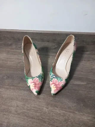 Elegantes zapatos de tacón con un estampado floral vibrante. Perfectos para añadir un toque de color a cualquier atuendo. - Tacón de aguja. - Cierre de hebilla. - Detalle de lazo en la punta. Para enviar o recoger en Tenor Fleta (Zaragoza)