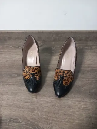Preciosos zapatos de tacón bajo con estampado de leopardo. Ideales para cualquier ocasión. - Son de piel. - Están en buen estado, aunque presentan algunas señales de uso.