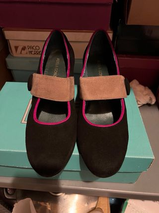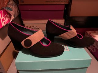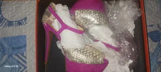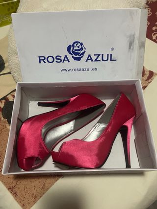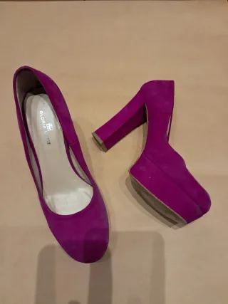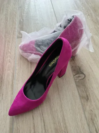 Zapatos de salon en color fucsia, con tacon bajito cuadrado. Talla 40. Por eso lleba media plantilla para rellenar porque yo soy 39. Son muy comodos. Son como de antelina. Solo puestos para dos eventos.