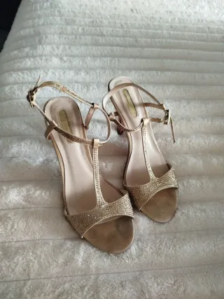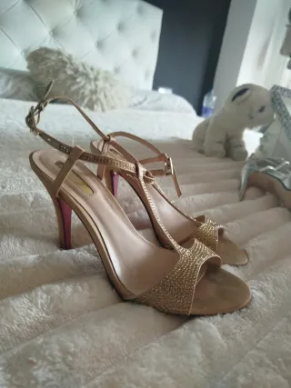 Elegantes zapatos de tacón en color dorado, perfectos para ocasiones especiales. - Adornados con pedrería brillante. - Tira fina con hebilla ajustable al tobillo. - Tacón de aguja con detalle en color fucsia.
