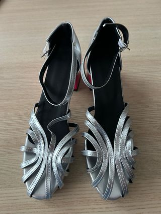 Elegantes zapatos de tacón con un diseño único y llamativo. - Acabado plateado brillante. - Detalle de tacón en color fucsia. - Tira ajustable al tobillo.
