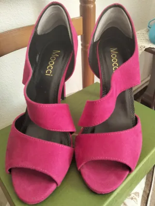 Elegantes zapatos de vestir de la marca Moocci en un llamativo color rosa. - Diseño abierto en punta. - Tiras cruzadas en el empeine. - Tacón alto. Color fucsia Usados un rato para una boda Tacón 10 cm Tiene otro juego de tapas sin estrenar