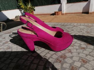 Zapatos salón número 38 de ante color fucsia. Usados una sola vez. Muy elegantes y estilosos. Se pueden llevar con vaqueros y con vestidos, faldas…Costaron 69€.