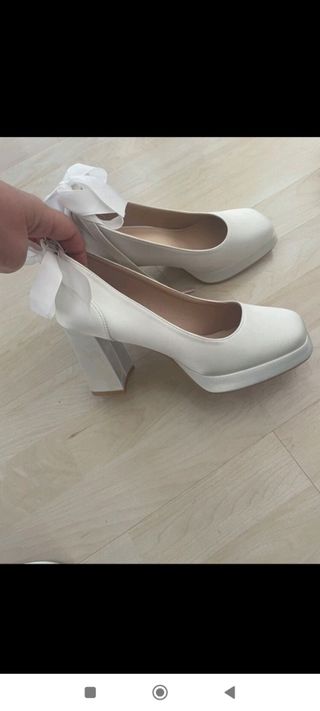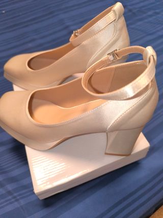Preciosos zapatos de novia en raso blanco,(aunque en fotos con flash parecen más beige son blancos roto), talla 40. Ideales para un look elegante y sofisticado. Apenas usados unas horas para boda civil. Van con lazo que se pueden poner o no. - Tacón grueso y cómodo. - Diseño de salón con tira al tobillo.