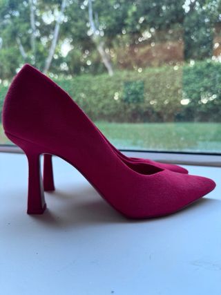 Elegantes tacones de ante en color fucsia. - Tacón grueso y cómodo. - Correa ajustable al tobillo. - Detalle de logo en la tira. - Fabricados en España. Sin estrenar, plantilla de piel, muy cómodos.