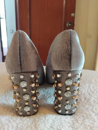 Elegantes zapatos grises con un diseño floral en relieve. El tacón está adornado con una pedrería brillante que combina tonos dorados y plateados. - Tacón grueso y cuadrado. - Acabado en terciopelo.