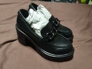 Elegantes zapatos de tacón de la marca Hispanitas. - Diseño tipo mocasín con detalle metálico. - Tacón grueso y plataforma. - Material exterior de cuero. - costaron 109e de rebajas, se adjunta ticket