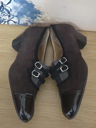 Elegantes zapatos de tacón con un diseño único.Material exterior de ante.Detalle de hebillas metálicas.Punta reforzada en charol.Tacón grueso y estable,mide unos 5cm. HAGO ENVÍOS