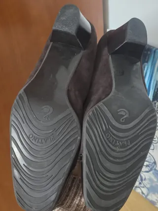 Elegantes zapatos de tacón con acabado en ante y detalles de piel. - Tacón grueso y plataforma. - Diseño de punta redonda. - Sin usar. - Precio original 89€. - Plantilla de gel.
