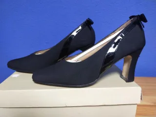 Elegantes zapatos de tacón con un diseño moderno. - Tacón grueso y cómodo. - Acabado brillante en la punta. - Material textil en la parte superior.son 24 horas total mente nuevos puestos una vez, se puede ver sin compromiso
