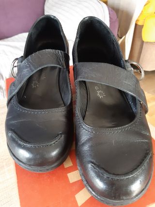 Zapato negro con cuña, se cierra con cinta lateral con hebilla. Es de piel. Talla 38. Muy buen estado.