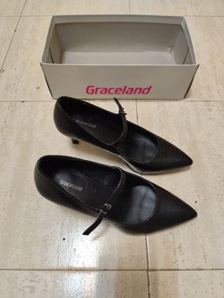 Preciosos zapatos de tacón de la marca Graceland. Son de color negro y talla 38. - Diseño elegante de punta afilada. - Material con textura de piel de serpiente. No son de piel.Tacon de 6,5 cm, medido desde la costura del talón del zapato