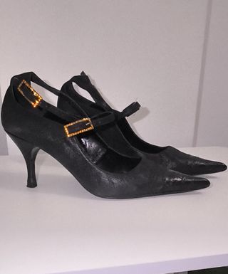 Preciosos zapatos de tacón negros, talla 39. Son de ante y tienen una fina tira de brillantes. Ideales para una ocasión especial. - Diseño de peep toe. - Estilo elegante y sofisticado. - Hebilla en el tobillo para un ajuste seguro.