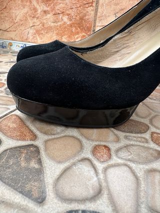 Preciosos zapatos de tacón alto, color negro. Son de ante y tienen una plataforma. Ideales para una ocasión especial. - Tacón alto y plataforma. - Diseño de tiras. - Material: ante. Solo tienen un uso.