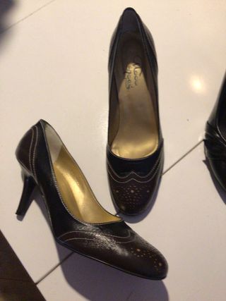 Lote de cuatro pares de zapatos de tacón. - Dos pares de zapatos negros con detalle de lazo. - Un par de zapatos marrones con picado. - Un par de zapatos marrones de corte salón. todos los tacones miden entre 9 y 10 cm. uno por 7€. pero más de uno por 5€.cada uno.