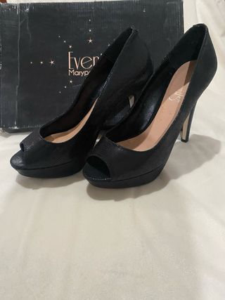 Preciosos zapatos de tacón de la marca Cortefiel. Son de color negro y de la talla 38. Están en muy buen estado. - Diseño elegante y sofisticado. - Tacón alto y fino. - Detalle trenzado en la puntera.