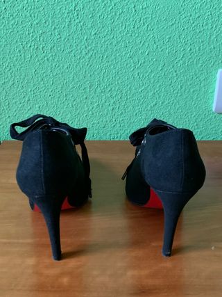 Zapatos serraje falso negro. Tacón 11cm. Lazos para atar acabados en punta de metal plateado y eyelets plateados. Suela interna y externa rojas.