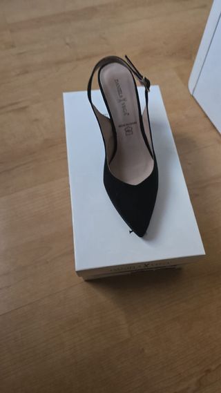 Preciosos tacones negros de la marca Zenyimi. Son de ante y tienen un tacón alto y fino. Ideales para una ocasión especial. - Tacón de aguja. - Diseño elegante y sofisticado. - Material: ante.