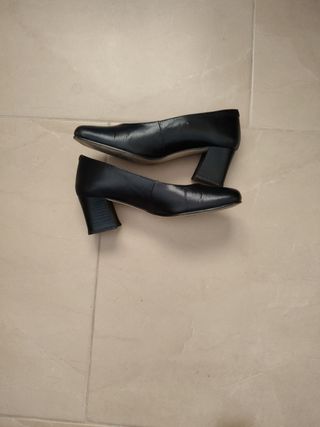 Zapatos de piel negros, de salón, con tacón cuadrado de Seis centímetros. Talla 36. Sólo los he utilizado en una ocasión. Están impecables.