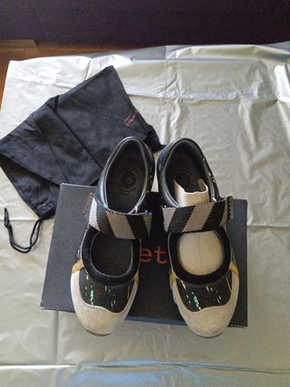 Vendo un par de zapatos Camper, talla 38. Son de color negro y gris, con un diseño moderno y original. Están en perfecto estado. En caja y embalaje original. - Diseño único con detalles en contraste. - Suela cómoda y flexible. - Cierre de velcro.