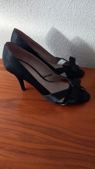 Preciosos zapatos de fiesta negros de tacón alto. Son de raso y tienen una pequeña flor negra en la parte delantera. Ideales para una ocasión especial. Puestos en una comunión. Conservan el embalaje interior. Muy cómodos con la plataforma delantera. - Tacón alto. - Diseño peep-toe. - Detalle de flor negra.