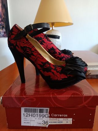 Zapatos de tacón de aguja, de 12 cm. Rojos oscuros con encaje negro por encima y con detalle de una rosa en la puntera. Con correas de cuero a la altura del tobillo para una mayor sujeción del pié. Viene con unos tacos nuevos de recambio para los tacones.
