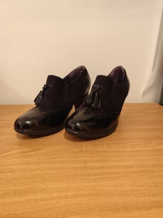 Zapato cerrado negro de cuero con algo de tacón. Algo dados de si en la zona del tobillo. Talla: 36.