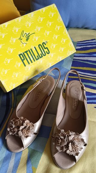 Elegantes zapatos de la marca Pitillos en talla 39. - Color dorado metalizado. - Diseño peep-toe con detalle floral. - Tira trasera ajustable. Usados dos veces unicamente. En la foto se puede ver el buen estado en el que estan.
