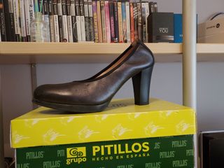 Preciosos zapatos de tacón de la marca Pitillos. Son de color negro y tienen un diseño elegante y clásico. - Son de piel. - Tienen un tacón cómodo. - Están en buen estado, aunque presentan algunas señales de uso.