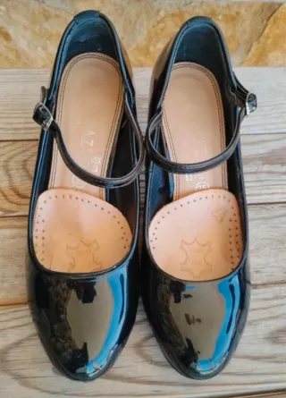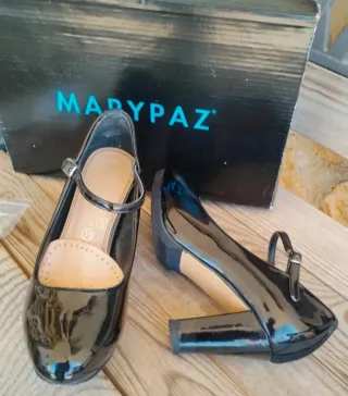 Zapatos Marypaz en charol negro, talla 35, modelo salón con pulsera al tobillo y tacón ancho de aprox. 7 cm (ver foto con la cinta métrica). Exterior en charol brillante y suela con muy poco desgaste. Diseño cómodo: Añadida pequeña plataforma interior para amortiguar la pisada Refuerzos internos para mejor soporte Plantilla interior en muy buen estado Incluyen caja original, etiqueta del modelo y tapas de repuesto. Estado: muy buen estado, usados pocas veces (las fotos lo muestran claramente).