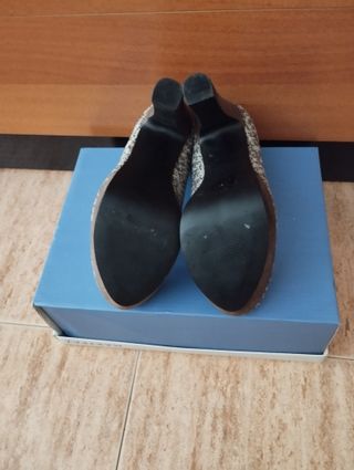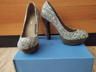 zapatos talla 40, color gris y negro , de tacon, son de piel y lleva plataforma. Se venden porque me los he puesto una o 2 veces como mucho pero no sé andar en tacon , la tapeta es la q venia de plastico esa seria para cambiarsela por lo demas estan bien cuidados ya q digo no me los puse mucho , son de marca chamby, el tacon mide unos 9,5cm y la plataforma delantera unos 2cm aprox. Le bajo el precio para hacer hueco en el estante y para q alguien le de uso q aqui no se le va a dar.
