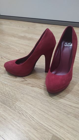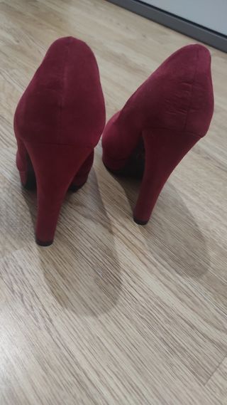 Zapato de vestir rojo/granate de ante, tacón alto con un poco de plataforma. Solo un uso.