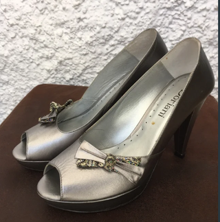 Elegantes zapatos con plataforma en color acero, ideales para boda, evento o celebración especial. Diseño sofisticado con adorno fantasía que aporta brillo y distinción sin resultar excesivo. La plataforma estiliza la figura y ofrece mayor comodidad al caminar, perfectos para lucir durante horas con seguridad y elegancia. 🧵 Hechos en España, excelente calidad y acabados. 🏷️ Procedente de tienda – Precio original 149€. 📦 Estado: Nuevo. 📏 Tallas: 38 y 39 Una opción premium para completar tu look de invitada con estilo y personalidad. - Diseño peep-toe. - Adorno de lazo con pedrería. - Tacón grueso y plataforma.