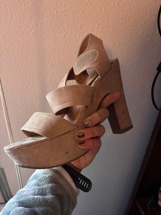 Tacones de marca Lody de material de ante con plataforma y tacón charol, de 10cm y n°36 equivalente al 37, con opción a ponerle correilla tobillo y plantilla de gel muy cómodos.
