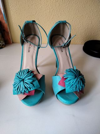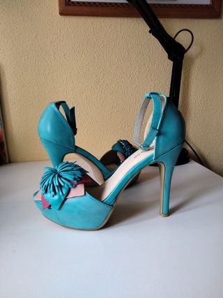 zapato de taconazo con un poco de plataforma( muy cómodos) con puntera abierta. De piel ( parecen de charol por su brillo ): color azul . sin marcas ni rozaduras( solo la suela de usarlos en 1 ocasión). impecable. en su caja original tengo cartera a juego( ver fotos). la cartera se vende a parte.