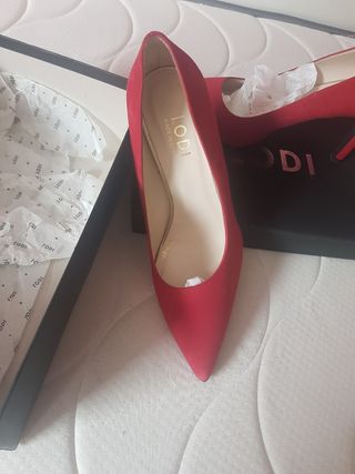 zapato de ante rojo Lodi. calidad asegurada .1 puesta . nuevos. Los vendo x qué me quedan estrechos. para combinar con vaqueros o vestido.