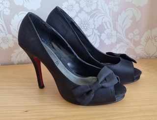 Zapatos de salón abiertos por delante forrados en tela, muy elegantes, usados una vez. Color negro y suela roja. Boda fiesta evento feria comunión bautizo