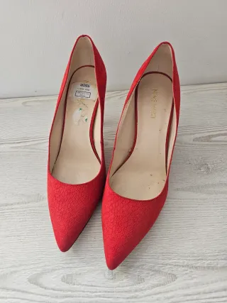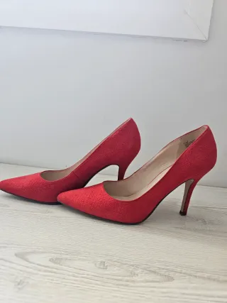 Preciosos zapatos de salón rojos, talla 41. Están en muy buen estado, usados solo una vez. - Tacón cómodo. - Material tipo ante.