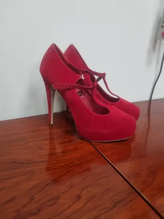 Elegantes zapatos de ante en color rojo con tacón alto y plataforma. Perfectos para destacar en cualquier ocasión. - Material: Ante - Color: Rojo - Talla: 46 - Diseño: Tacón alto con plataforma y tira al tobillo