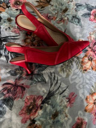 Elegantes zapatos de ante en color rojo. - Diseño slingback. - Detalle de tiras. - Tacón fino.