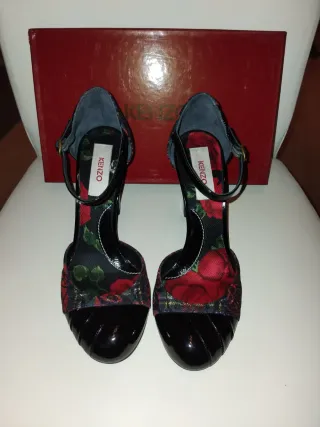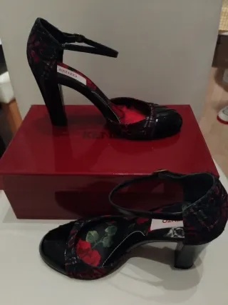 Elegantes zapatos de tacón con un diseño llamativo. - Estampado floral de rosas rojas. - Combinación de materiales. - Cierre de pulsera al tobillo.
